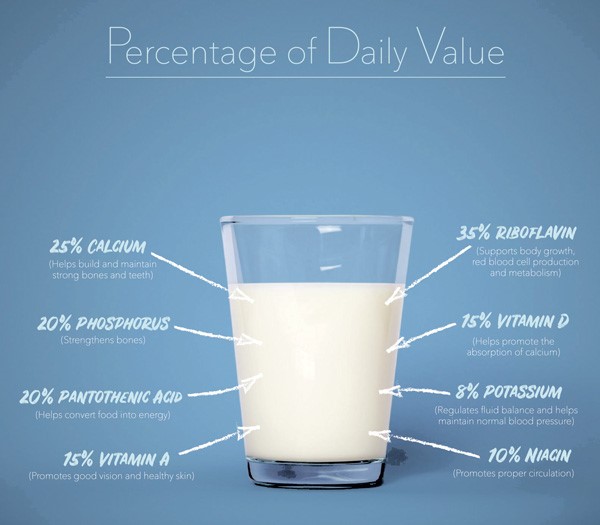 Other than that it reduces high blood pressure and lowers cholesterol. All in all it gives you the ability to fight illnesses, to recover from them and to increase your immunity. Milk is a rich source of calcium, protein, carbohydrates, vitamins, minerals and fat, since each glass contains 8 grams of protein. Milk is rich in many other nutrients that are essential. For stronger bones (Calcium, Vitamin D, and Phosphorous), for more energy (B vitamins), for a stronger immune system and for healthier skin (Vitamin A). Fats in milk constitute essential fatty acids which are important for body cells.